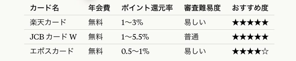 迷ったらまず楽天カードかJCB カード Wのどちらかを作っておけば間違いありません。リボ払いだけは絶対に避けて、賢くポイントを貯めていきましょう。